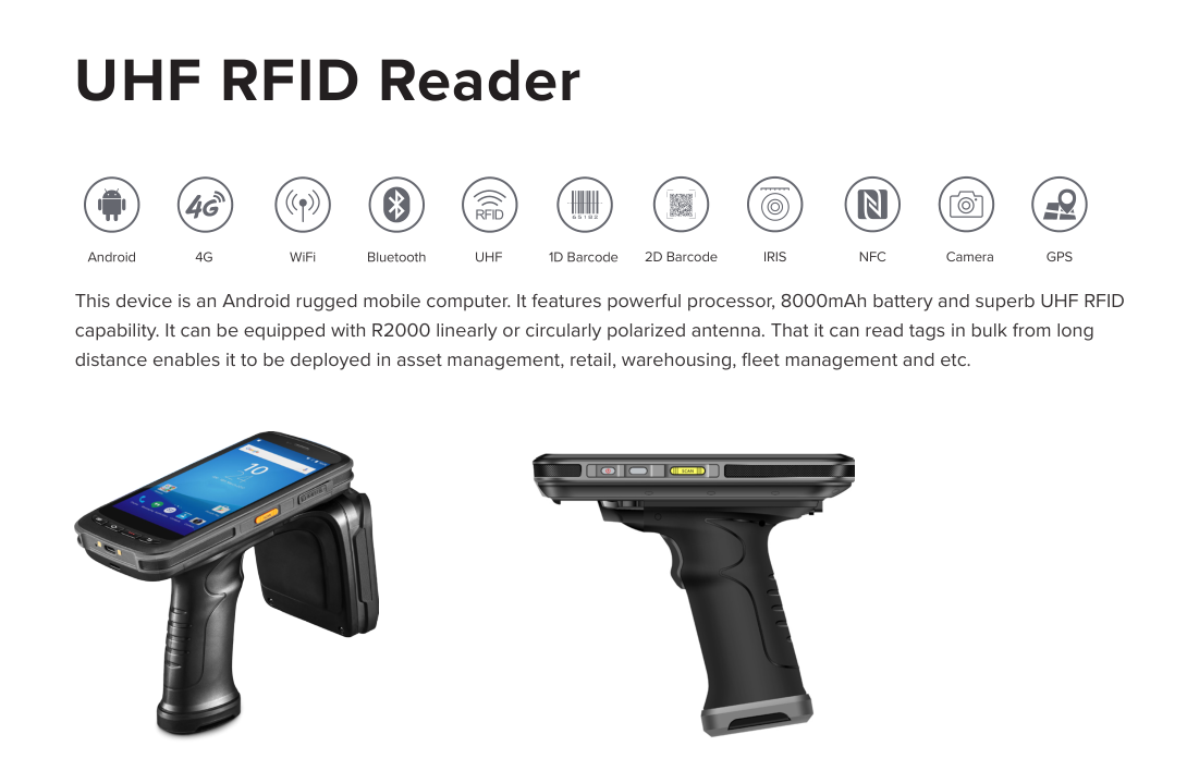 JT-972 डिवाइस एक मज़बूत एंड्रॉइड मोबाइल कंप्यूटर है। इसमें शक्तिशाली प्रोसेसर, 8000mAh बैटरी और शानदार UHF RFID तकनीक है।